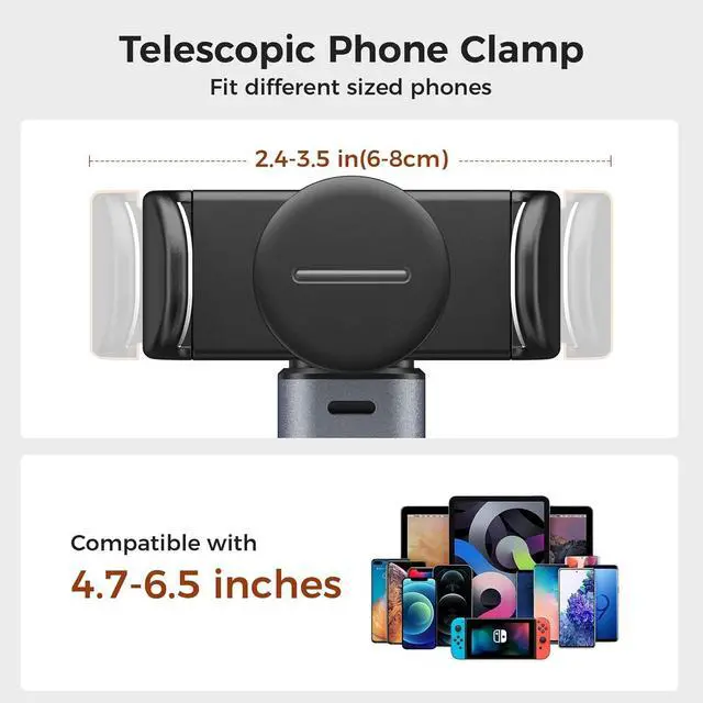 360° Rotating Phone Holder: The telescopic phone clamp can securely hold most smartphones ensuring a solid grip on your phone during recording. The 360° rotatable design of the overhead phone mount enables easy switching between portrait and landscape modes. The protective pads on the clamp can prevent scratches and avoid slippage even during angle adjustment. Ideal for