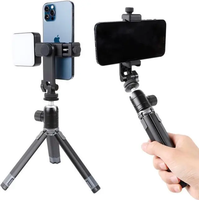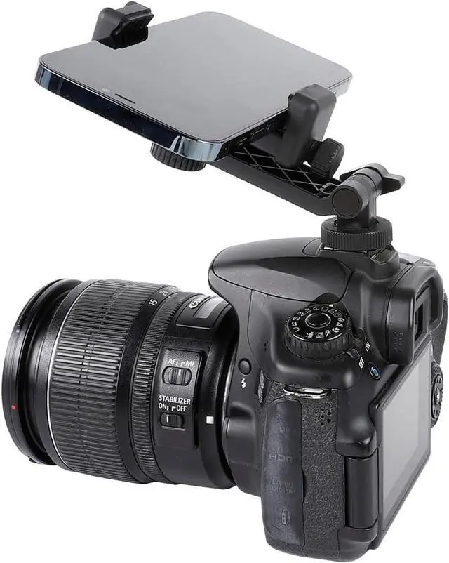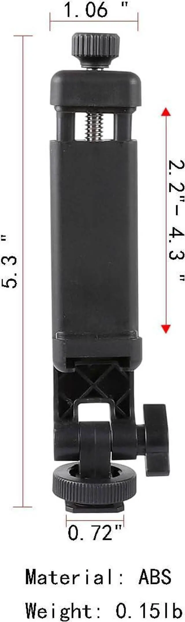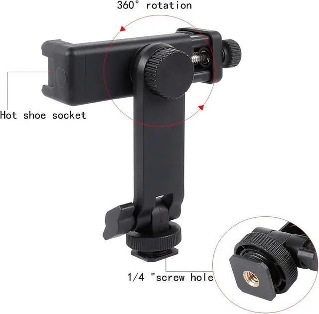 360 degrees adjustable support phone horizontal and vertical shooting. Adjustable angle design allows you to fix on the tripod or camera hot shoe mount and adjust the pitch-angle. Bottom with 1/4 screw hole which can be used for all tripod and other types of equipment; Also has its own hot shoe lock which can be fixed on the camera hot shoe mount. With a cold shoe mount which allows fixing microphones or photographic lights and other equipment. Made of abs material.