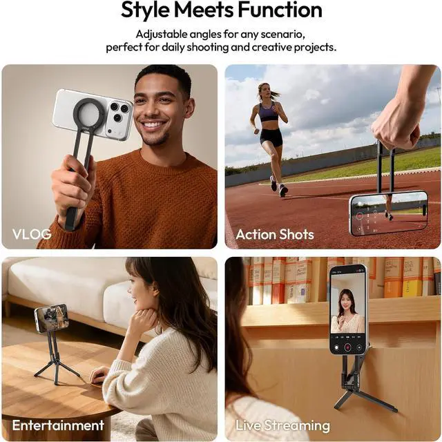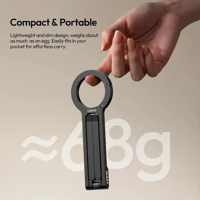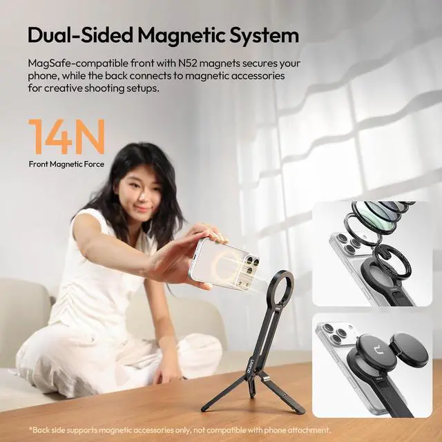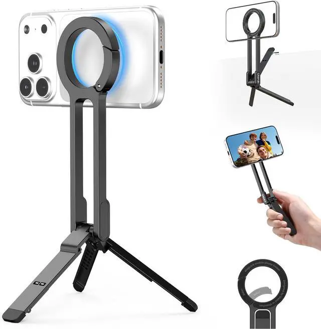 Capture dynamic angles and elevated shots effortlessly. Wide Compatibility Compatible with iPhone 1217 series (including Pro/Pro Max/Plus/Mini). Works with MagSafe cases directly. Other smartphones can attach securely using the included metal ring. Patented Quick-Clip Compact & Travel-Ready Designed with a patented quick-clip and carabiner-style grip for fast secure attachment. Made of durable lightweight ABS plastic this foldable mini tripod is pocket-sized for easy carrykeeping your hands free and ready to shoot anytime anywhere.