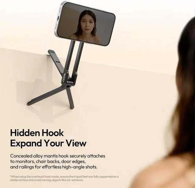 4-in-1 Creative Shooting Modes Works as a desktop stand handheld selfie stick mantis-hook mount and mini tripod. Perfect for vlogging live streaming video calls and daily shootingadapt easily to any creative scenario. 14N Strong N52 Magnets Double Secure Hold Built-in high-performance N52 magnets deliver up to 14N of powerful magnetic force keeping your phone firmly attached and stable in any shooting scenariowhether vlogging live streaming or capturing dynamic angles. 180° Rotation & Hidden Mantis Hook Switch instantly between front and rear cameras with 180° rotation. The hidden mantis hook securely hangs on monitors doors or cabinetsno tools needed.