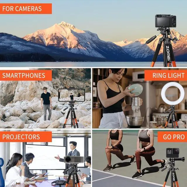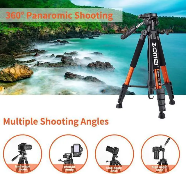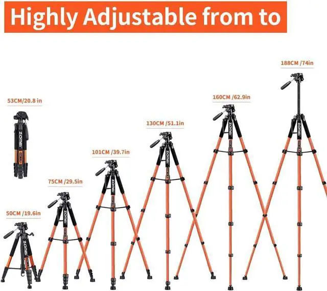 Multi-functional extension designThe tripod can shrink to a minimum of 20.1 inches and extend to a maximum of 74 inches This tripod fully adapts to a range of different user heights and enables you to compose your photos more creatively than ever before. Multi-angle Shooting The compact camera tripod is equipped with a stable smooth ergonomic 3-way pan head: headlock pan lock and tilt lock which can satisfy all the needs of vertical horizontal and overhead photography etc. You can freely adjustable angles for 360° panoramic shooting 180°up and down shooting and 90°vertical portrait. When you employ pans and tilts during photo or video recording the tripod offers superb stability and gives you excellent smooth results. Universal Phone HolderThe tripod provides a universal 360° rotating phone holder extending from 58mm( 2.3I nches) to 95mm 3.7I nches) that fits most smartphones. High CompatibilityWhether you use a Nikon D3500 Fuji X-T200 Canon EOS 250D Olympus Panasonic mobile phone iPad projector network camera Gopro or sight our camera tripod is compatible. Widely ApplicationThe heavy duty 74 inch camera tripod is suitable for photographing events and video recordings such as selfies family portrait photos parties traveling hiking sports YouTube Vlog video conferencing online meetings live streaming recording games yoga videos outside with wind and other activities indoors and outdoors. 3-position leg angle adjustment system helps you take photos flexibly for different scenarios and photography conditions.