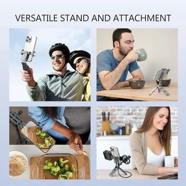 Multiple Angles Available? Flexible angle adjustment allows you to tilt easily exploring great shots from different angles. Foldable Effortlessly fits into your pocket ideal for on-the-go useDual Cold Shoe Mounts? 2 cold shoe on the phone clip to mount your video lights or microphones at the ends of the phone clamp to keep creativity flowing. Vertical & Horizontal? Enjoy the freedom to seamlessly switch between vertical and horizontal mode with two height options. Strong three-foot structure and anti-slip silicone pad enhanced stability preventing your phone from falling