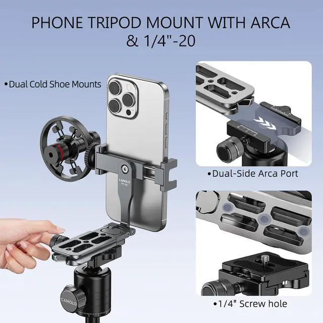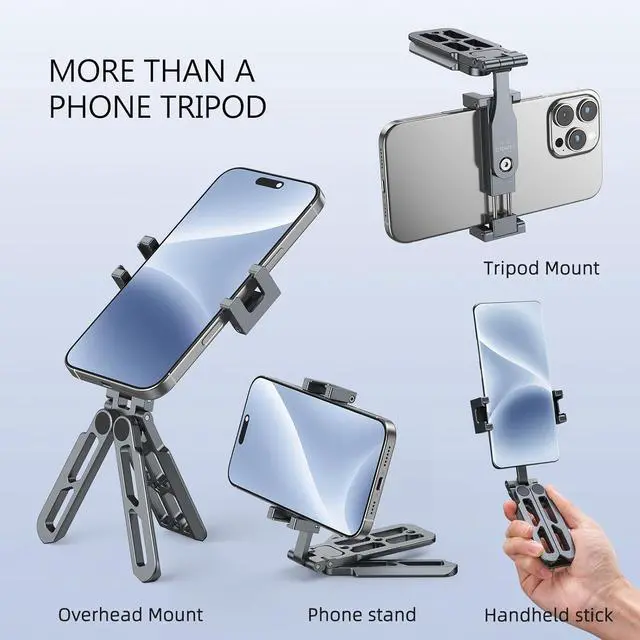 More Than A Phone Stand? Easy to expand and fold it can be your binge-watching partner or a handheld stick for vlogging. Compatible with iPhone 17/16/15/14/13/12 Plus / 17 Air /16 Pro Max/X/XS/XR/ 8 plus Pixel 8 pro Galaxy S24/S23 edge Motorola TCL etc. Suitable for most smartphonesArca Base Phone Tripod Mount? Fold the split legs effortlessly convert into an Dual Side Arca quick release plate allowing rapid attachment to any tripod head with the identical mounting system. The pocket mount also boasts 1/4 screw holes & cold shoe for seamless integration with tripods monopods gimbals and more other systems.