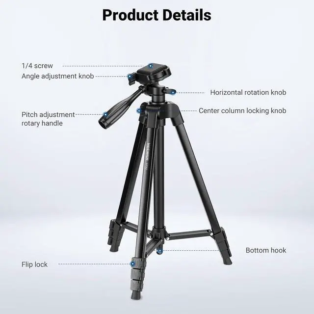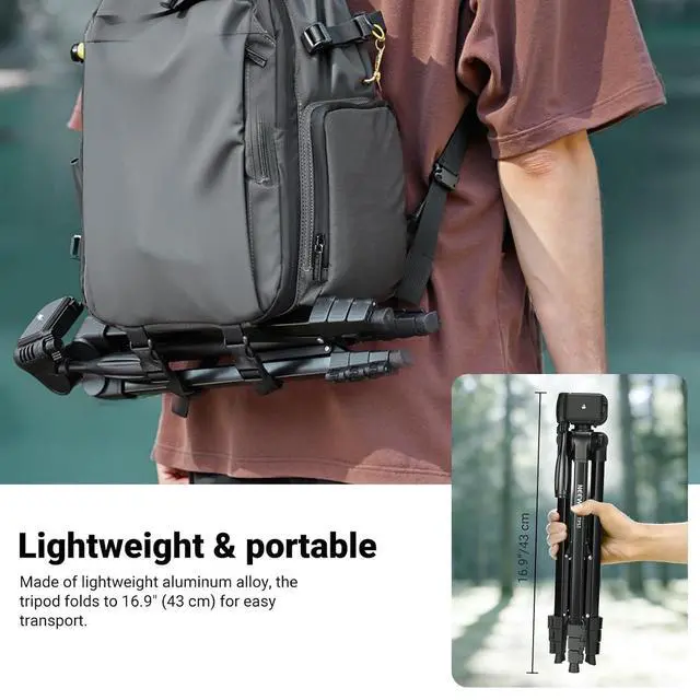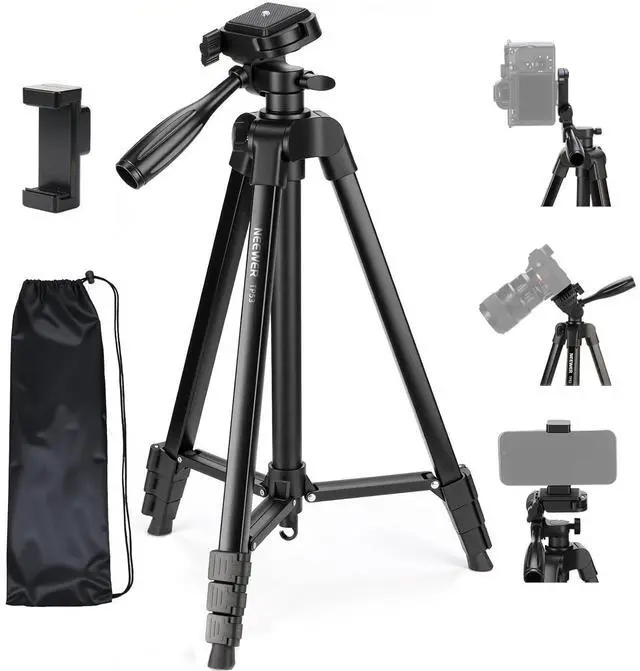 Introducing NEEWER ENTRY LEVEL VERSION Even simpler than BASICS NEEWER ENTRY LEVEL VERSION is designed with ultimate simplicity and affordability in mind perfect for absolute beginners who only need the most essential functions without any complexity or extrasMetal Build Travel Tripod Made of heavy duty aluminum alloy the lightweight tripod with phone holder attachment securely mounts a DSLR (compatible with Canon Sony Nikon cameras) action camera (adapter not included) or smartphone up to 3.3 lb/ 1.5 kg for selfies vlogging creation live streaming filmmaking etc. At 1.25 lb/568g the portable tripod folds down to 16.9 /43cm with the included carrying bag for photography on the go.
