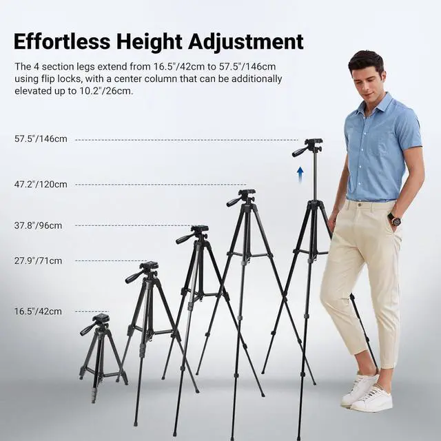 Besides the tripod head enables 360° panoramic capability to capture sweeping landscapes and allows for +90° to -70° tilt with a detachable handle to switch from right or left for different hand dominants. Professional tripod equipment for cameras and phonesEffortless Height Adjustment The 4 section legs can be easily adjusted from 16.5 /42cm to 57.5 /146cm using flip locks. At the same time the center column can be additionally elevated up to 10.2 /26cm providing flexibility to capture every satisfying shot. Also with a hook on the bottom center column to hang weights for added safety