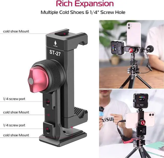 It also has a 1/4 screw port at the bottom for connecting to tripods. Built from solid aluminum metal its durable and safeDual Side Cold Shoe Mounts The ULANZI ST-27 smartphone tripod mount offers two side cold shoes for mounting a fill light and a microphone simultaneously. Its an excellent choice for vloggingWide CompatibilityThe phone tripod mount is compatible with a broad range of devices including iPhone 16/15/14/13/12 series iPhone 11 series iPhone X/Xs/XR/Xs Max iPhone 8/7/6 series S10/S9/S8 series Note series and many other brands and models