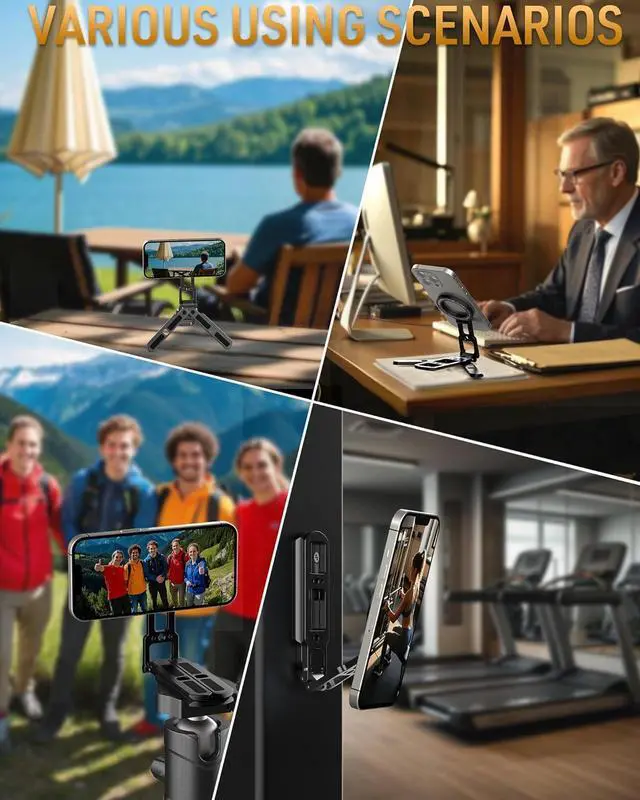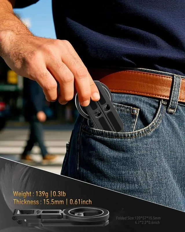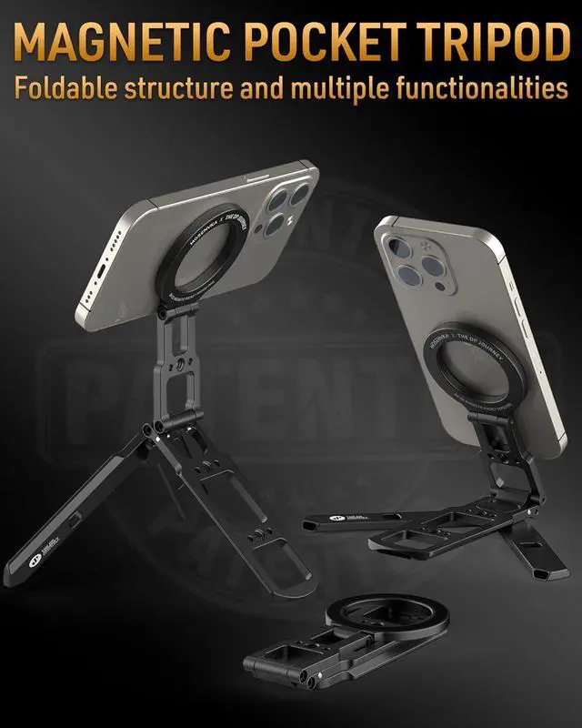 ????????????????????????????????????????????????????????: This magnetic Phone tripod features an innovative dual-sided magnetic system. Magnetic ring is equipped with powerful N52 magnets ensuring a secure and stable attachment between your phone. Split Legs also built in N52 magnets. The double-sided magnetic design allows you to effortlessly attach your phone to any ferrous surface.?????????????????????????????????????????????????????????? This lightweight phone tripod weighs only 139 grams with a fully extended height of 6.5 inches (measured from the center of the magnetic ring) suitable for a wide range of devices and provides comfortable viewing angles. When folded its slim 1.55 cm ( 0.61 in) profile ensures easy storage in your pocket or bag making it the perfect companion for outdoor adventures video recording and on-the-go use.????????????????????????????????????????????????: Easily fold the three split legs to transform this mount into an Arca compatible quick release plate enabling instant attachment to any tripod head with the same mounting system. Additionally the pocket mount features with 1/4 screw holes for seamless compatibility with tripods monopods gimbals and other accessoriesmaking it a versatile tool for photographers and videographers alike.???????????????????????????? -????????????????????????????????????????: This innovative magnetic tripod features a tri-fold design with dual-axis adjustment allowing both the metal arm and magnetic ring to be positioned at any angle. Its freely angle adjustment design enables flexible adjustments for a wide range of shooting positionsoverhead upward vertical and moremaking it effortless to capture the perfect visual from any perspective.????????????????????????????????????????????????????????????????????: This magnetic tripod is fully compatible for iPhone 16/15/14/13/12 Pro Max series as well as official magnetic cases. The included magnetic metal ring extends compatibility for iPhone 11 and earlier models magnetic stand for iphone 16se for iPad mini for Android phones and non-magnetic cases delivering a secure and stable like experience for all your devices.??????????????????????????????????????????: Unlike traditional magnetic tripods its dual-sided design offers unmatched versatilityuse it on desktops tripods gym equipment refrigerators metal doors shelves and any other magnetic or metal surfacesmaking it the perfect companion for any metal surfaces. Multi functional phone tripod perfect for hands-free convenience in any setting.