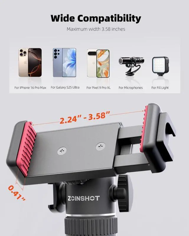 Compatibility: The universal phone holder is support most smartphones with a width of 56-90 mm / 2.24 - 3.58 inches. This multifunctional tripod features a 1/4 inch screw mount making it compatible with mini fill lights mics digital cameras and action camerasLightweight