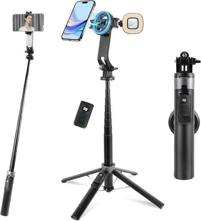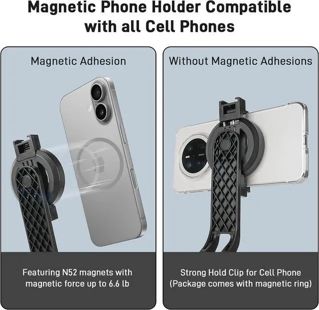 Powerful Magnetic Phone Tripod: Enjoy ultra-strong magnetic attraction for a secure shake-free grip on iPhone 16/15/14/13/12 series. Easily switch to the adjustable clamp for a firm hold on any smartphone allowing you to capture your best moments with ease and stabilityDual