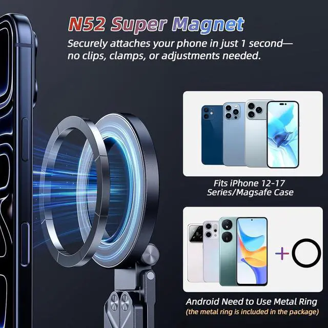Compatibility: Supports iPhone 17/16/15/14/13/12 Pro Max iPad mini/Air/Pro series and magnetic cases. The included metal ring extends compatibility to iPhone 11 earlier models Android phones and non? magnetic casessecuring all your devices