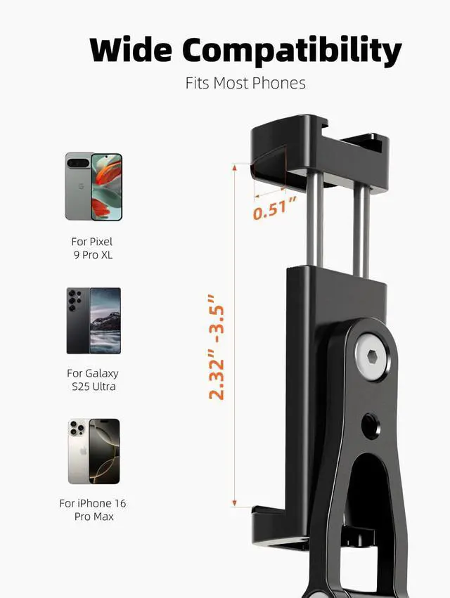 Universal Phone Compatibility:?? Adjusts from 2.32 to 3.5 to securely grip all smartphones??. Works as a standalone?? phone camera mount?? or with?? tripod phone holder?? systems??