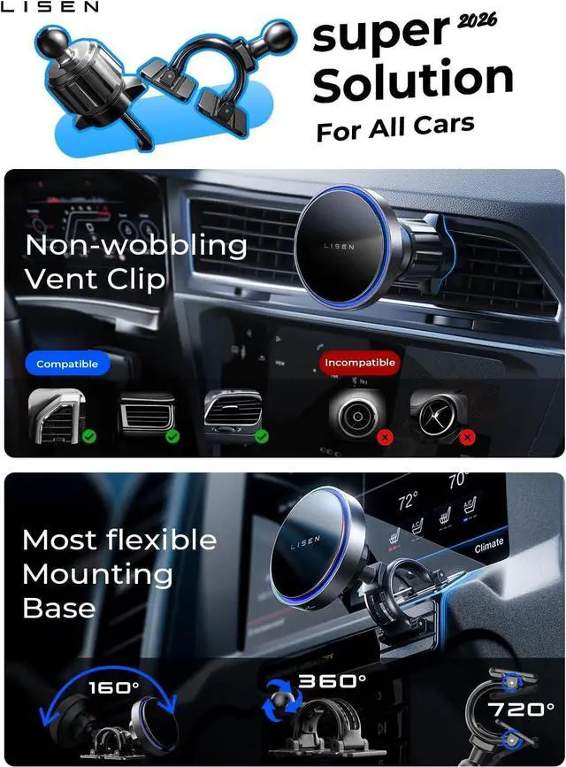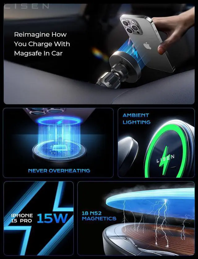 Premium Design: LISEN MagSafe Car Wireless Charging Mount for iPhone uses official Tora-TC Heat Sink for long-term stable use ensuring superior quality and functionality compared to other products.