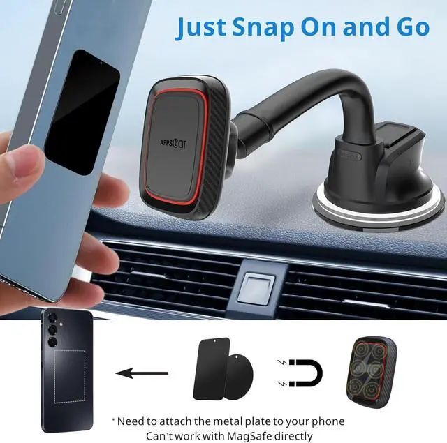 NOTE: This magnetic car mount cannot work with MagSafe directly; please attach the metal plate below the MagSafe area.