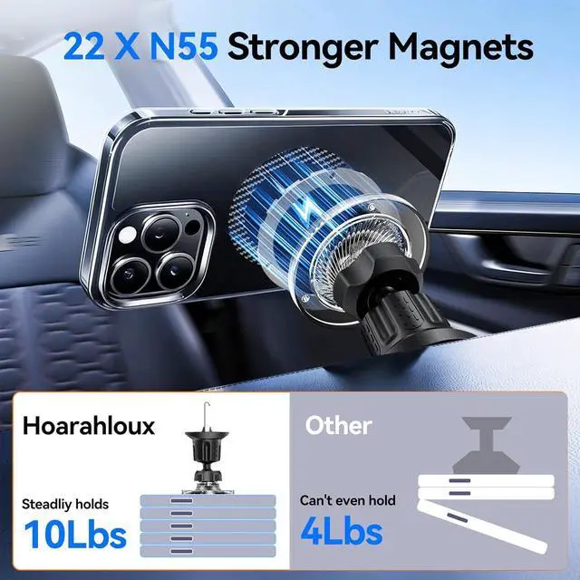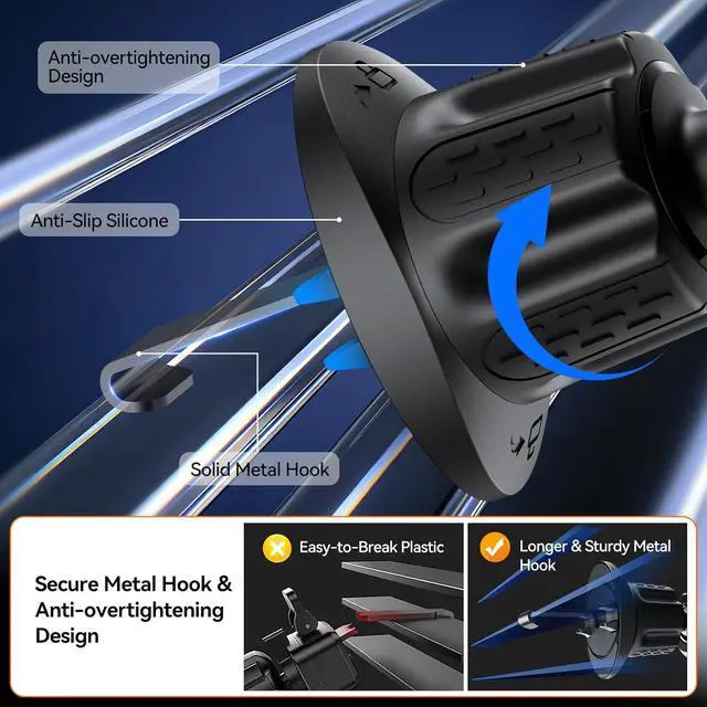 Strong Magnetic Car Phone Holder with 22 N55 MagnetsBuilt with 22 high-grade N55 magnets this car mount for MagSafe provides powerful and stable adsorption. It holds your phone tightly even on bumpy roads sudden brakes or sharp turns preventing shaking slipping or falling for safer and more stable driving. Air Vent Mount for MagSafe with Stable Triangular StructureThe vent clip and metal hook form a stable triangular structure with strong load-bearing capacity. It clamps tightly to the air vent and effectively resists vibration keeping the mount and your phone stable on all road conditions. Vent Protection & Durable Premium DesignThe adjustable locking knob prevents over-tightening and protects your car air vent from scratches and damage.