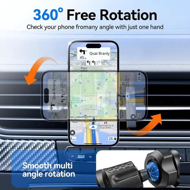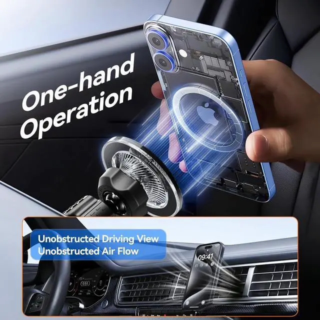 Constructed with a sturdy metal hook instead of fragile plastic this car phone holder is more durable safer and more reliable than standard mounts with quality visible in every detail. One-Handed Operation & 360°Adjustable ViewingSimply place your phone on the mount for instant one-handed operation. The 360° rotating ball joint allows flexible switching between portrait and landscape modes without blocking your driving view air vent airflow or phone signal. MagSafe Compatible & Universal CompatibilityExclusively optimized for MagSafe this car vent phone holder works directly with iPhone 12 13 14 15 16 17 Pro Max and all MagSafe-compatible cases.