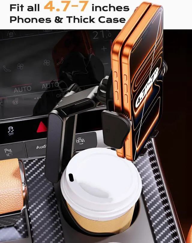Cups: This cup holder cell phone holder fits all 4.7 -7 inches phones with thick cases. (It is not suitable for zflip and zfold). It's easy to pinch the clamp arm to hold the phone and release the phone by the button on the back of the holder. Thanks to the hollow base the inner space of the original cup holder can be preserved. This allows the cup holder cell phone holder to hold almost any cups coffee cups can drink bottle and more.