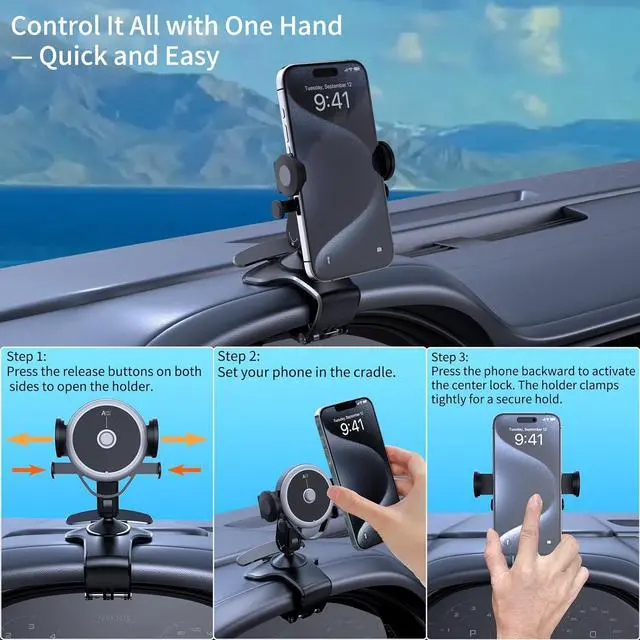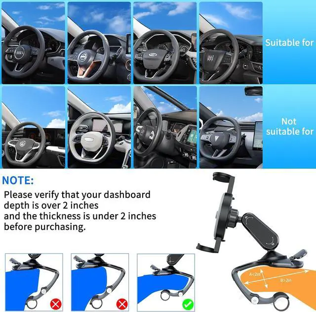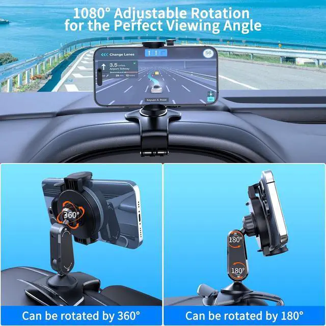 360° Full-Angle Adjustment & Secure One-Handed Operation Enjoy the perfect viewing angle with 360° horizontal rotation AND 180° vertical tilt. Easily adjust your phone between portrait and landscape mode with one hand while driving. Secure Mounting Zero Damage & Universal Fit Features a powerful spring clip design with non-slip base and curved silicone pads. It mounts securely on any dashboard (textured curved or smooth) sun visor or rear-view mirror without leaving sticky residue or causing damage to the dashboard. The universal clamp fits dashboard edges up to 2 inches thick and less than 2 inches depth.