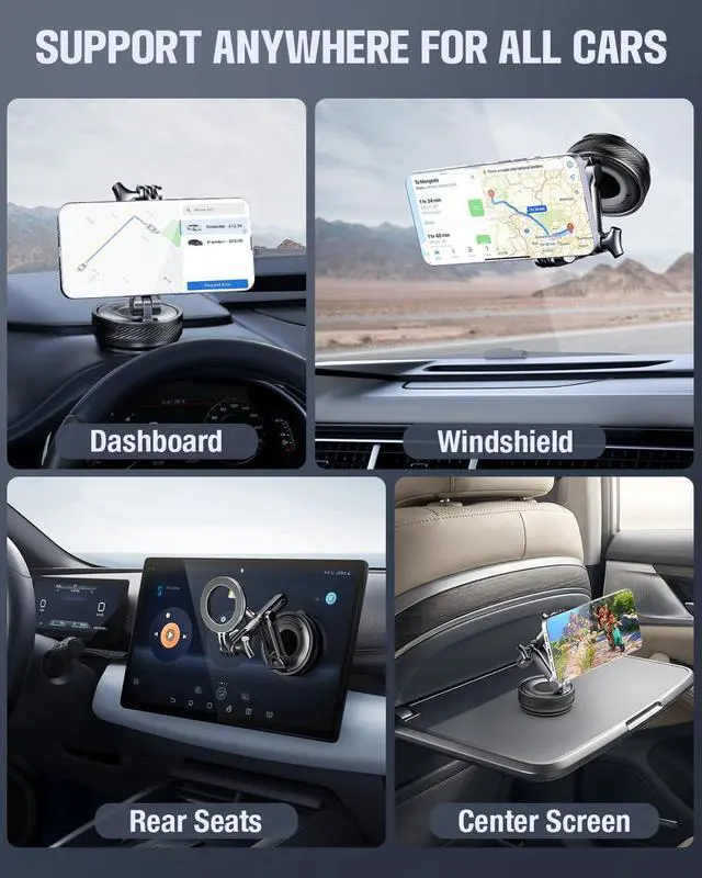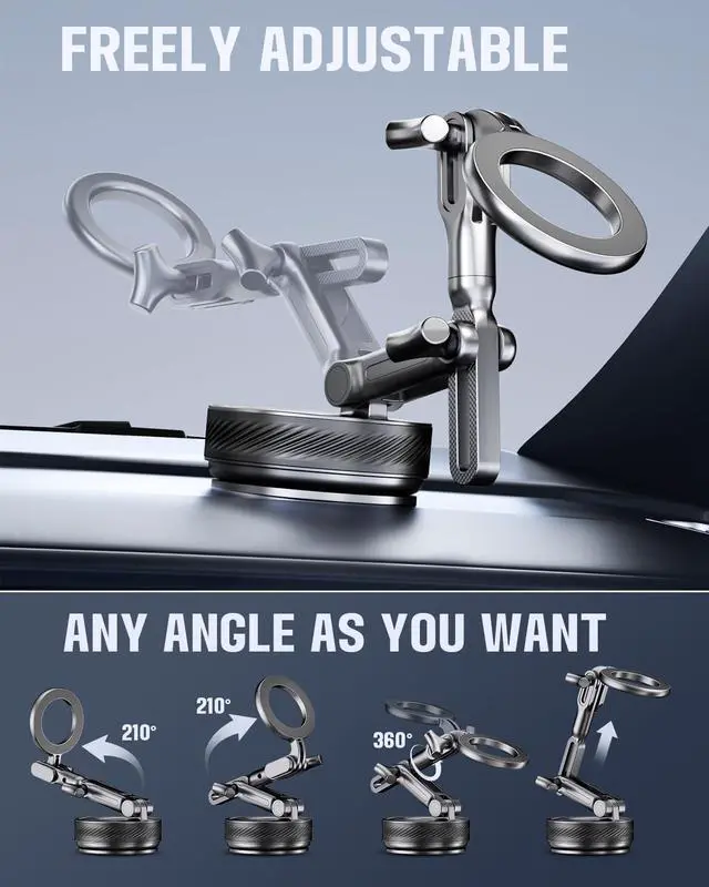 Easy to Use AnytimeOur adjustable 360-degree rotating vacuum car phone mount features an upgraded four-layer nano-gel suction cup base with rotating vacuum sealing technology. Simply twist the knob to securely attach it to flat surfaces like leather dashboards windshields center consoles or side windows. Its holding power is 80% stronger than traditional press-on mounts staying rock-solid even on bumpy roads.