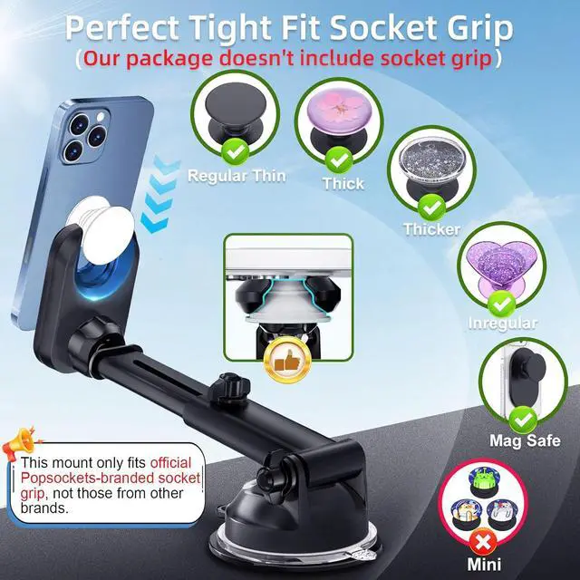 Mini): This dash mount phone holder for pop socket is very friendly to socket phone grip users. Can accommodate thin flat and thicker top with expanding kickstand collapsible grip for magsafe phone grip with phone wallet pop phone card holder swappable top pop it slide stretch grip etc (Note: The mount only fits official PopSockets-branded sockets Not compatible with other brandsnon-official socket grips may fit too snugly and be hard to pull out)Strong