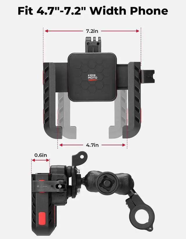 Material: The KEMIMOTO phone mount is constructed from high-strength PA66-30GF. It remains durable and reliable even in the harshest conditionsFitment:? Fit handlebar diameter from 0.5 '' to 1.26 (12-32mm). The KEMIMOTO phone mount is compatible with s bikes golf carts electric scooters ATVs and more and works well with 4.7 to 7.2 smartphones (thickness < 0.6 )
