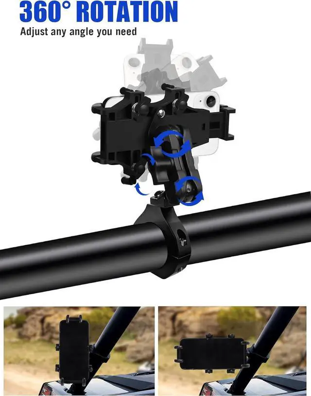 For off roadZIDIYORUO UTV phone mount with aluminum bracket fit for 1.75 -2 Roll Cage compatible with Polaris RZR Maverick can am X3 Kawasaki Mule Teryx Arctic cat wildcat Honda pioneer Talon CFMOTO and etc360°rotating 360°rotating UTV cell phone holder effortlessly tilt rotate or switch between portrait and landscape to get the perfect screen angle right where you need itConvenienceThis SXS phone mount holder can easily insert or remove your phone with one hand even with gloves on so you can stay focused on the rideSolid & DurableHeavy duty UTV phone mount wiht aluminum alloy bracket keeps your phone locked in place no matter how rough the terrain getsSafetlyRoll cage phone mount with 8 secure clamps and non-slip silicone your phone won't budgeeven when the trail gets wild sturdy and secureCompatibleUTV phone clamp compatible 4.7 - 7.1 cell phonesEasy installationJust 2 simple steps and you're ready to ride.