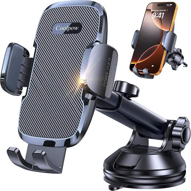 Strong Suction 3-in-1 Cell phone Car MountThe upgraded Coolpow car phone mount features a powerful suction cup air vent clip and 3M VHB adhesive base. Easily attach it to your dashboard windshield or air vent. Perfect for most cars pickups SUVs trucks and wagons.