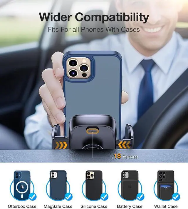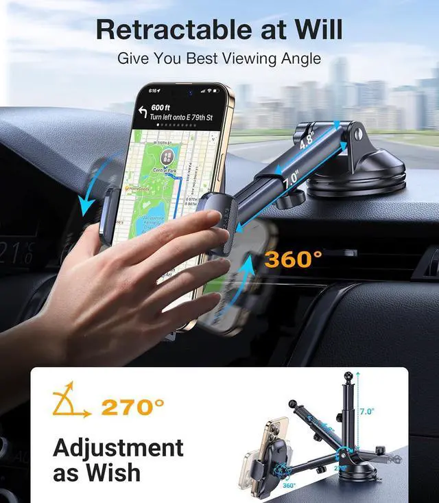Note: Compatible only with horizontal and vertical vents. Not suitable for circular ventsReliable & Stable Suction CupBuilt with a 3-layer nano-gel base for strong adhesion this car phone holder keeps your phone stable on all roads. It's designed to stay secure and resist falling off during stops sharp turns or sudden braking. Stays firmly attached in both hot and cold weather with no risk of melting or deforming. If the base gets dirty and loses grip simply rinse it with water and dry to restore its stickiness. Installs and removes without damaging your car360° Full-Angle Adjustment for the Perfect ViewExperience total flexibility with our 360° rotatable ball head and adjustable telescopic arm which extends from 4.5 to 7.2 inches. This car mount allows you to effortlessly position your phone in either landscape or portrait orientation and customize the viewing angle to your preference. Whether you're navigating taking calls or controlling playlists your device stays securely in the ideal spotoffering a clear comfortable view of the screen while maintaining full visibility of the road ahead. One-Hand OperationDesigned for a smoother safer drive this phone mount for car features a complete upgrade. Its unique one-touch release system is highly responsive letting you effortlessly release your phone with a single hand.