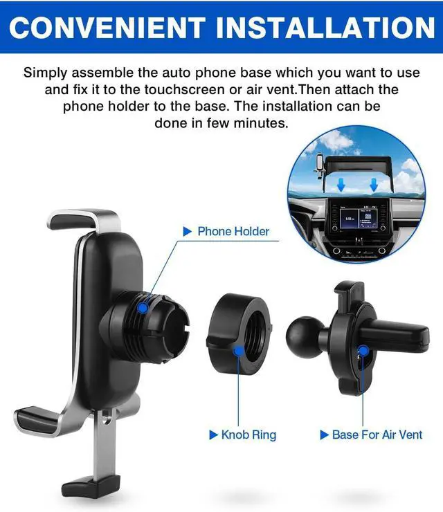 The pivoting ball joint of the phone mount can rotate 360° easily switch the phone to any angel. Excellent Material---The support skeleton and surface of the holder are specially made of black aluminum alloy which not only improves the quality but also guarantees the beauty. And the bases of the phone holder are made of high quality ABS material sturdy and durable. Convenient Installation---No drilling or any tools required. Simply assemble the auto phone base which you want to use and fix it to the touchscreen or air vent. Then attach the phone holder to the base.