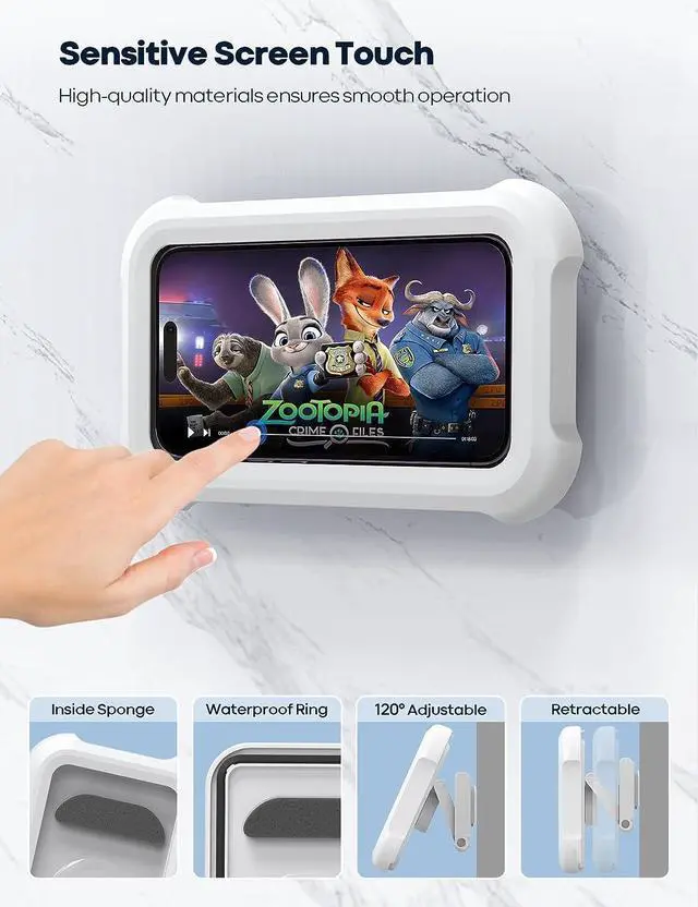 Rotation & Adjustable: With the unique rotation and retractable design this waterproof shower wall phone holder support 120 degree angle adjustment and 360 degree horizontal and vertical rotation ideal for changing the distance and viewing angle. This shower phone holder can be used to play on the phone at your desired position and protect your phone from water while in showerHD