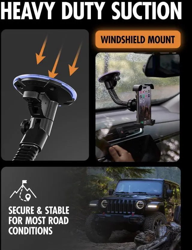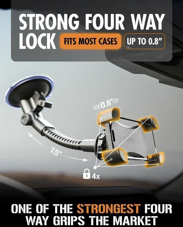 MAXIMUM 4.25 INDUSTRIAL SUCTION: Our massive 4 1/4-inch suction cup delivers a rock-solid military-grade grip on glass. Multiple pressure-lock points ensure this phone mount never fails even during the bumpiest drives.
