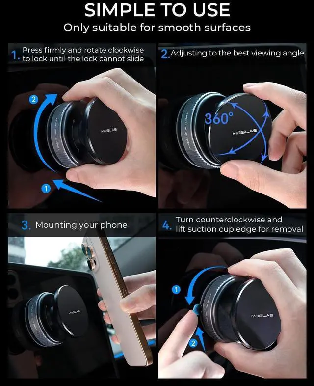 Quick Setup: Designed for iPhone 17/16/15/14/13/12 series and all MagSafe compatible devices the stand also includes a magnetic ring to ensure strong magnetic attachment for non-MagSafe phones. It has a wide range of compatibility for almost any model and installation is effortless. Simply turn the dial to attach it to any smooth surface and twist it the other way around to remove it without leaving any residue.