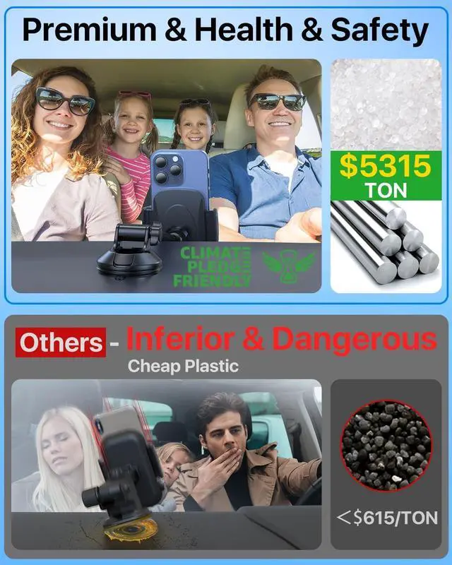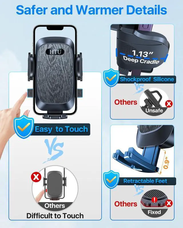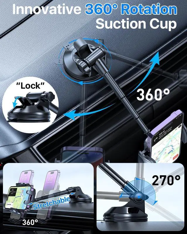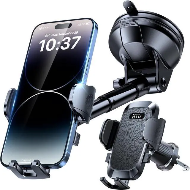 [Are You Searching for Presents? ] It is a good practical Present for parents lovers siblings colleagues and employeesATTENTION: If your dash is LEATHER TEXTURED or CURVED which NOT suitable for ALL suction cups. Please use the mount on the windshield. Before installing the suction cup be sure to clean the dashboard to ensure it is clean and tidy. Rinsing & air-drying the bottom of the suction cup can restore stickiness. [Super Suction Cup Rough Road Friendly] The upgraded suction cup enlarges the base and adjusts the center of gravity which makes the suction cup more stable and never falls. It adopt 2-level locking mechanism which is 3 times stronger than ordinary suction! The suction cup is made of 3 layers of nano sticky gel which can prevents air gaps from forming and can withstand the temperature from -40°F to 203°F. The enhanced suction power is up to 88LBS it holds heavy phones effortlessly. [Unobstructed View] The suction cup base of the HTU upgraded version of the mobile phone holder can be rotated at any angle at 360° without removing the bottom. HTU upgraded car phone holder has the 360-degree ball joint and the adjustable telescopic arm( 5.52 to 8.86 ) so that mobile phone within easy reach convenient navigation answering calls.