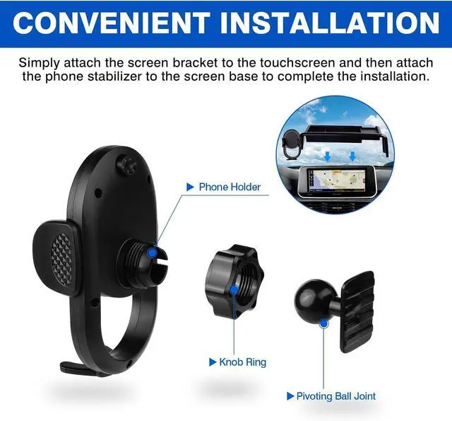 It can ensure your dashoard is not messy and keep small items such as keys cash and phone well-organized. Allowing you to have a clutter-free and organized storage experience! Premium Material---The phone holder mount is made of high-grade ABS material which not only improves the quality but also guarantees the beauty. Super durable and firm. The flat edges and smooth surface make it look like an OEM part. Simple Installation---No drilling or any tools required. Simply attach the screen bracket to the touchscreen and then attach the phone stabilizer to the screen base to complete the installation.