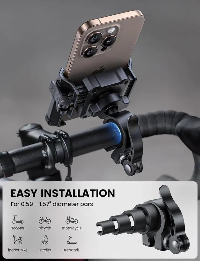 Lock & Release NOTICE: The width of the phone clip can be adjusted. Turn the knob counterclockwise to enlarge the width of the phone clip then turn the knob clockwise to grip your phone. Finally lock the safety lock up to secure your phone firmly. Once settled you can enjoy the fast installation in the future one hand to install and release. Secure & Stable Grip The phone holder for bike features a reinforced clamp and silicone padding to prevent drops even on bumpy roads. Ensures your device stays secure whether youre commuting touring or hitting off-road trails. One-hand Operation No need to push just put the phone in with one hand lock the buckle and go. A truly easy-to-use phone mount. And its 360° adjustable design lets you rotate your phone horizontally or vertically for perfect visibility. for 4.7 -7 Phones This bicycle phone holder securely fits 2.3 - 3.54 wide cellphones such as iPhone 17 Pro Max iPhone Air 16/ 15/ 14/ 13/ 12 Pro Max Mini iPhone 16 Plus iPhone Xs Max Xs XR X iPhone SE Galaxy S25 Ultra S24 Ultra S23 S22 S21 more. The max thickness the phone clip can holds is 0.59.