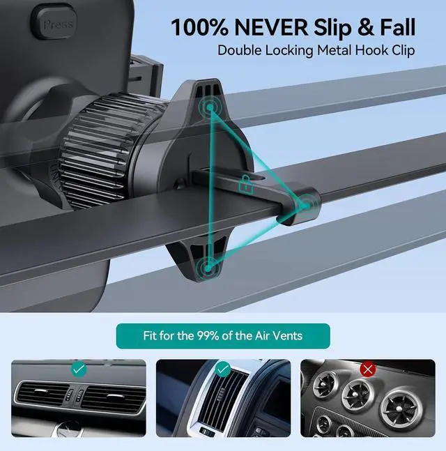 [ Perfect Protection ] The car cell phone holder side clip & foot are equipped with super soft vacuum anti-slip rubber and thick panel forming a solid triangle structure. Cellphone holder for car Not only can firmly clamp the phone but also effectively prevent the phone from bumping scratching and rattling. Providing comprehensive protection for your phone even at high speeds bumps or turns can also prevent scraping and dropping. [ Easy to Use & Wide Compatibility ] The car mount for iphone is equipped with a one-touch release button that can release or lock the phone in seconds with a single touch.