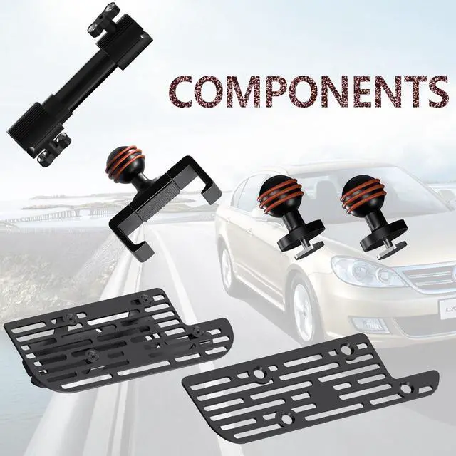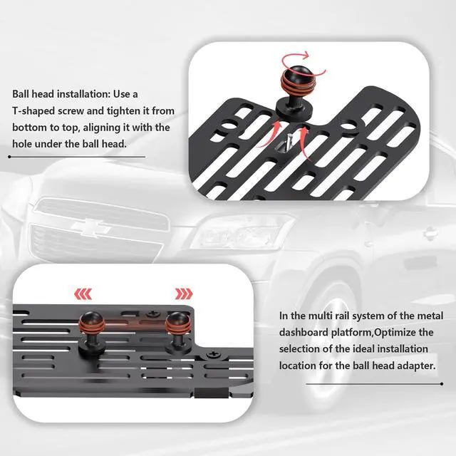 Single ball head installationUse a T-screw and tighten it from bottom to top aligning it with the hole under the ball head. PACKAGING INCLUDES1 x base platform mount 2×Grid roof (1x for 12 screens and 1x for 5 and 8.4 screens) 1 x double socket arm (telescopic extension rod) 1 x mobile phone stand 2 x 25mm aluminum alloy ball head base