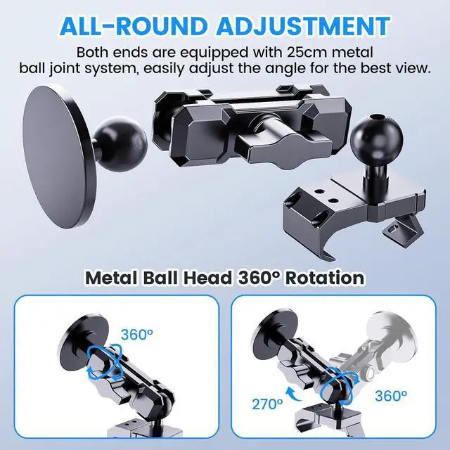 Rotation: This aluminum alloys phone holder has a highly flexible metal ball-joint that supports 360° rotation that allows you to freely adjust the angle and direction expanding your driving visibility for safer driving and You can flexibly use your phone for recording GPS shooting etc..