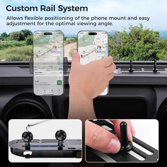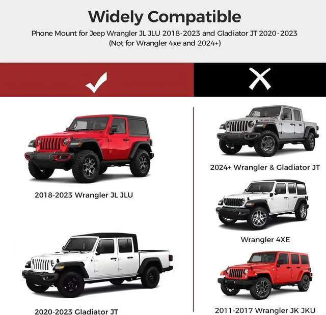 FITMENT: DIAMOOKY metal phone mount compatible with Jeep Wrangler JL JLU 2018 2019 2020 2021 2022 2023 and Gladiator JT 2020 2021 2022 2023 including Rubicon Sahara (Not for 4xe & 2024+). It is a versatile phone holder integration system that allows you to customize and place your device exactly where you want it.