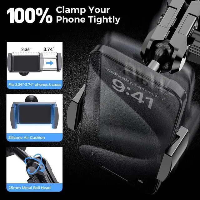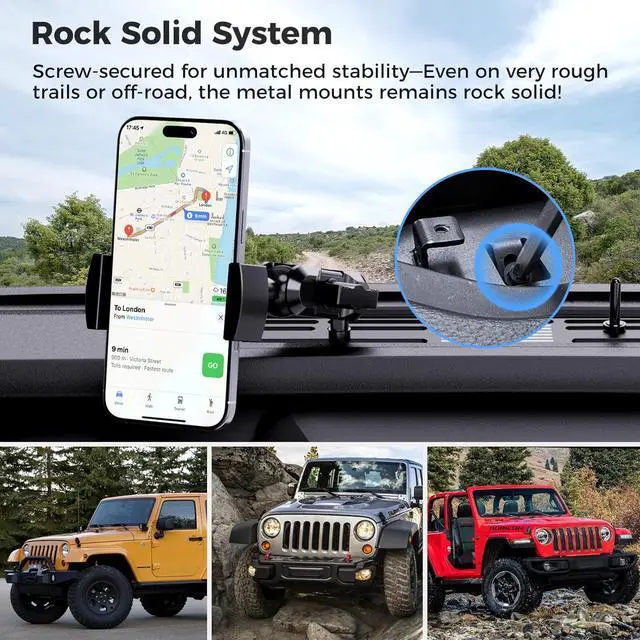 ROCK SOLID SYSTEM: The metal dash phone holder adopts all-metal structure. After tightening and fixing your mobile phone for the Wrangler JL phone mount will be firmly fixed where you need it even on very rough trails or off-road.
