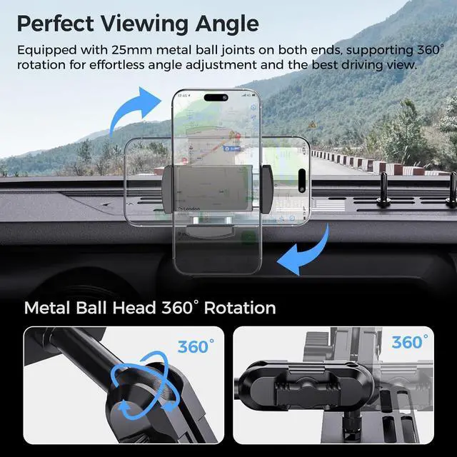 FLEXIBLE ADJUSTMENT SYSTEM: The metal dash mount features two highly flexible metal ball joints supporting 360° rotation. Easily adjust the angle and direction for flexible use of your devices for recording GPS shooting and more.