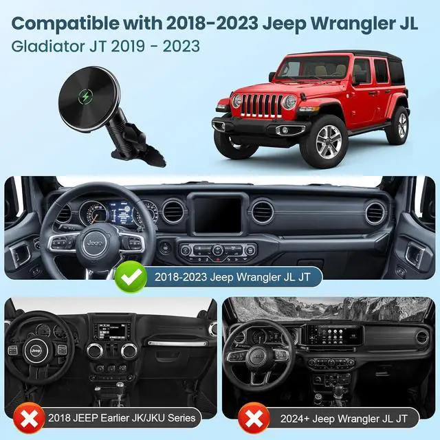 Exclusive CustomizationThe wireless charger with magnetic phone mount kit is specifically designed for Jeep Wrangler JL 2018-2023. Including Rubicon 4xe Mojave. It not fit for JK & 2024+ models. This air vent phone holder of jeep wrangler is only designed for OEM dashboard not compatible with third party modifications15W Wired Fast Car ChargerWith upgraded reinforced copper coils Kaishengyuan wireless car mount charges 40% faster than standard wireless charger mount. And built-in smart chip it can intelligently recognize wireless fast charging devices and prevent overheating and short circuit ensure the safety of your phoneSuper Strong Magnetic Force & Device ProtectionThe jeep phone magnet holder features 20 built-in magnets that provide exceptional suction power keeping your phone securely in place even on the bumpiest roads or cobblestone streets.