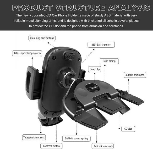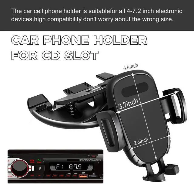Installation Steps: First insert the base into the CD slot. Then press and hold the buttons on the top and bottom of the back to adjust the reach arm and foot rest to the proper position. Finally just snap your phone in and press the buttons on either side to lock it in place.