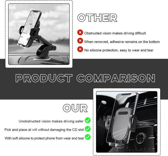Rotatable Design: Our cell phone holder comes with a 360° flexible rotating ball. This allows you to adjust the angle of your phone at will for the best viewing angle. It makes it easier to use your cell phone or GPS navigation while driving and improves driving safety.