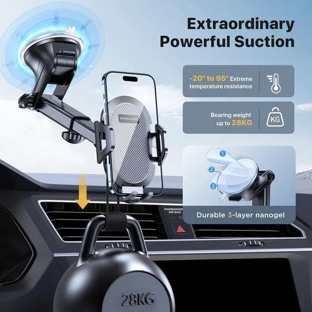 STRONG SUCTION POWER: The cell phone car mount uses a powerful 3-layer viscous gel and a 1-step locking mechanism to provide strong suction on a smooth surface without leaving any residue. They will not fall off even when turning bumping or driving at high speeds and using TPU material can withstand temperatures from -4°F to 203°F. To restore the stickiness simply rinse with warm water and let it air dry.????????: Most likely will not work on leather/ vinyl dashboards. BIG PHONE & THICK CASE FRIENDLY: Super wide and deeper adjustable clamp arms enable Miracase cell phone holder for car to fit for all cell phones ( 4.0 - 7.2 inches) and thick phone cases such as compatible with iPhone 15/15 Plus/15 Pro/15 Pro Max/14/14 Plus/14 Pro/14 Pro Max/13/13 Pro/13 Pro Max/13 Mini/12/12 Pro/12 Pro Max/12 Mini/SE/11 Pro Max/11 Pro/11/XS MAX/XS/XR/X/8/8 Plus/7/7 Plus Galaxy S23/S22/S21/S20/S10/S9/S8/S7 series Sony LG Google Pixel and most mobile phones GPS devices. TELESCOPIC ARM AND 360