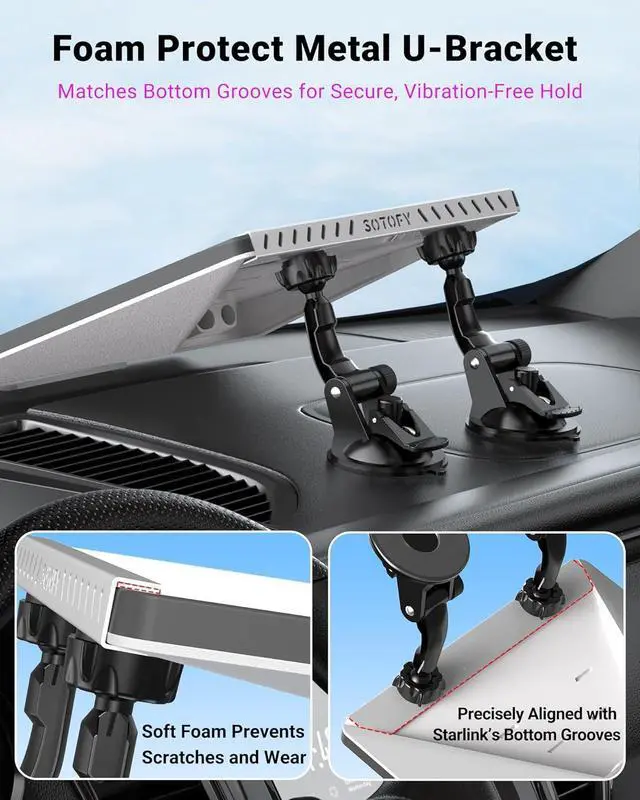 360° Fully Adjustable Positioning: This SOTOFY starlink mini car mount includes a 360° rotating joint and 180° adjustable arm helping you align your starlink mini antenna for optimal signal while maintaining clear visibility. Ideal for mobile setups and starlink mini mobility mount applicationsFoam-Protected