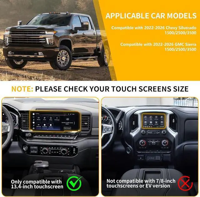 APPLICABLE CAR MODELS: Magnet dash mount phone holder accessories are compatible with 2022 2023 2024 2025 2026 Chevy Silverado 1500/2500/3500 with 13.4 Touchscreen; compatible with 2022 2023 2024 2025 2026 GMC Sierra 1500/2500/3500 with 13.4 Touchscreen.