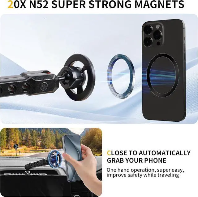 N52 STRONG MAGNETS: For Chevy Silverado phone mount adopts 20X N52 magnetic phone holder had a strong magnetic force to hold the phone steady during off-road driving. When your phone close to it automatically grabs your phone one-hand operation super easy then hands free improve safety while travelingSLIDE RAIL/DOUBLE BALLS 360°