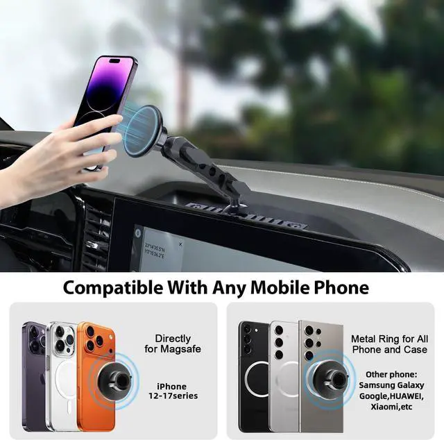 Adjustable NATO Rail DesignEquipped with a NATO sliding rail and clamp allowing for easy adjustment of the mounting position on the center console. Provides flexible viewing angles to meet navigation or entertainment needs. You won't need to take your eyes off the road which is the greatest guarantee of safety. Powerful Magnetic HoldBuilt with 20 strong N52 magnets this mount keeps your phone firmly in place even on rough roads. Fully compatible with MagSafe iPhone (iPhone 12 to iPhone 17). If you're using a case make sure it is MagSafe-compatible. If not you can attach the included small metal ring to your case (provided the case has a flat surface).
