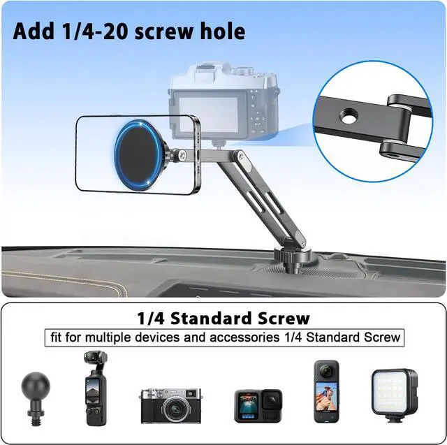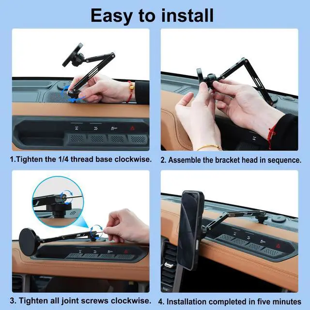 It will not crack or deform even at high temperatures. It perfectly integrates with the dashboard using the original factory-reserved mounting holes without damaging the original car or affecting its aesthetics. After tightening the 1/4 screw base to the car use the included tools to tighten the joint screws allowing you to complete the installation in just 2 minutes! Magnetic and Magsafe RingThis phone holder features a strong magnetic design allowing it to attach directly to magnetic phones. Equipped with a Magsafe metal ring it allows even phones that are not normally magnetic to attach to the phone.