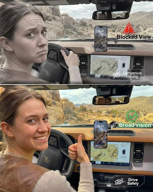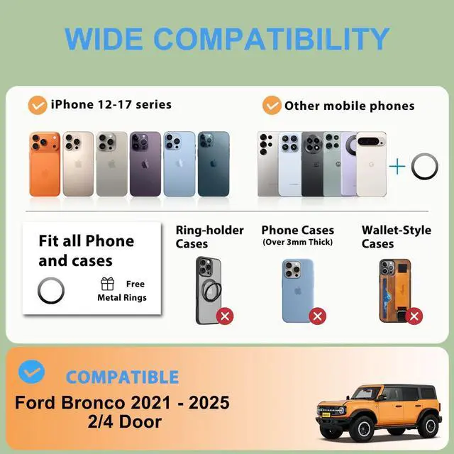 Compatible ModelsThis magnetic phone mount is designed specifically for 2021-2026 Ford Bronco models. Without damaging the original vehicle we provide Bronco owners with a good view for navigation! New upgrade unobstructed viewThe length has been upgraded to 8.3 inches and can be extended under the dashboard so you no longer have to worry about the view being blocked. Foldable design you can choose the length you want at any time. Safe and reliable it is your best choice! Aluminum Alloy Material & OEM DesignThe phone mount is made of sturdy aluminum alloy with reinforced joints.